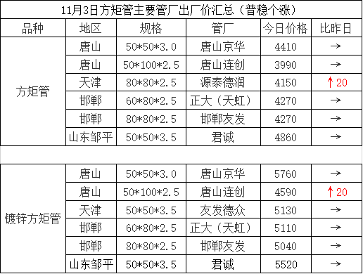• 11月3日方矩管主要管厂出厂价汇总(普稳个涨)