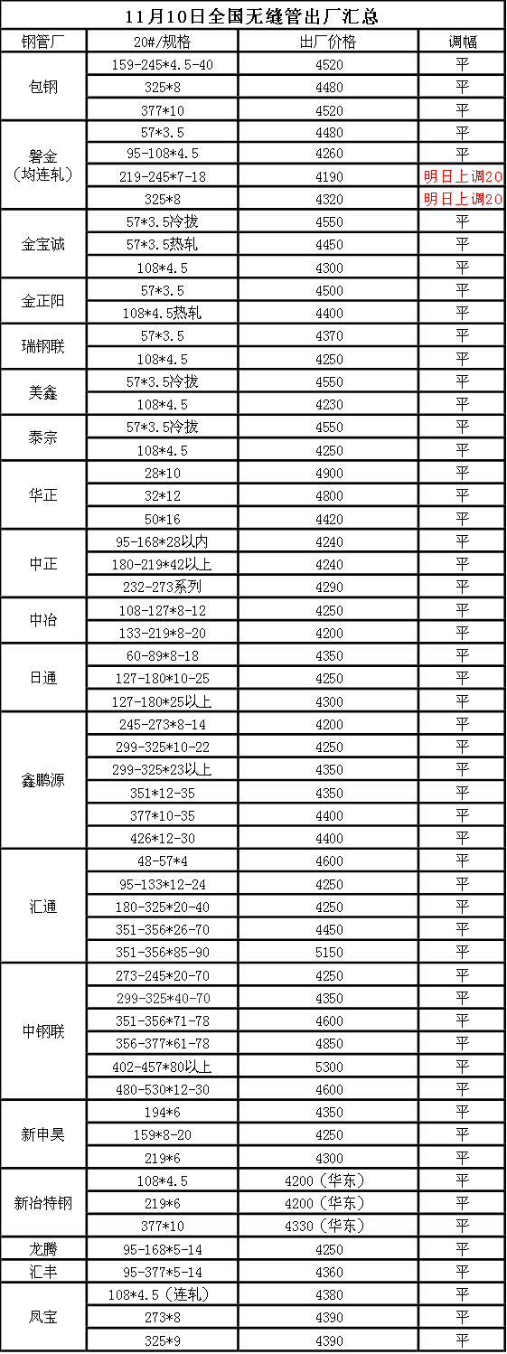 11月9日全国无缝管出厂汇总(累计上调50元)
