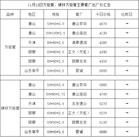 • 11月12日方矩管、镀锌方矩管主要管厂出厂价汇总