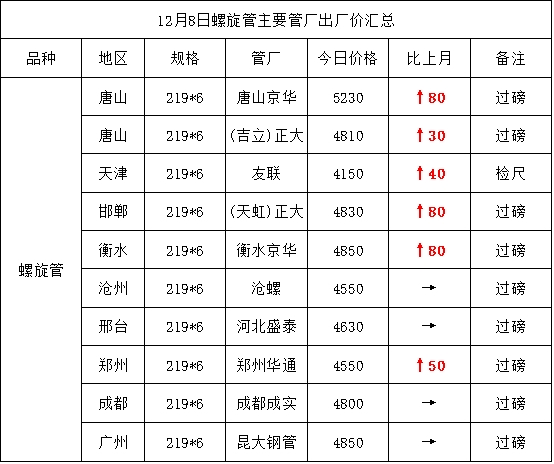 • 12月7日螺旋管主要管厂出厂价汇总(上调50-100元)