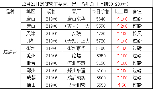 • 12月21日螺旋管主要管厂出厂价汇总(上调50-200元)