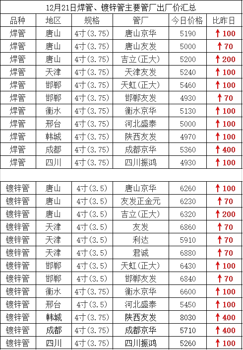 • 12月21日焊管、镀锌管主要管厂出厂价汇总(普涨70-400元)