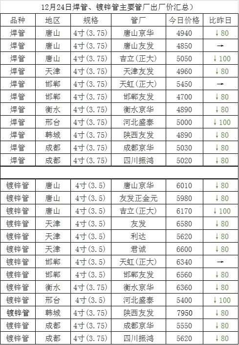 • 12月24日焊管、镀锌管主要管厂出厂挂牌价汇总