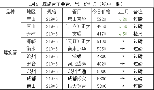 • 1月4日螺旋管主要管厂出厂价汇总(稳中下调)