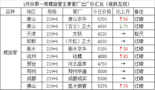 1月份第一周螺旋管主要管厂出厂价汇总(涨跌互现)