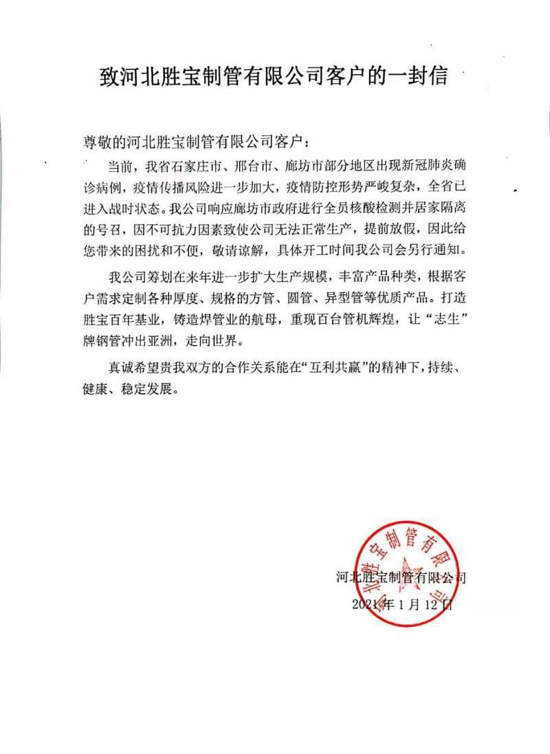 市场快报:1月12日,廊坊市从今天开始与市外相通的路口进行24小时严密查控,人员、车辆非必要一律不得流出。胜芳地区黑退方管厂河北胜宝制管有限公司发布通知响应廊坊市政府号召,因不可抗力因素致使公司无法正常生产,提前放假,具体开工时间另行通知。据调研当地其他管厂暂未发布放假通知,封闭小区、全员检测尚未执行到位,均表示将积极响应政府指挥。