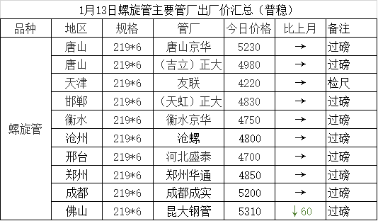 • 1月13日螺旋管主要管厂出厂价汇总(普稳)
