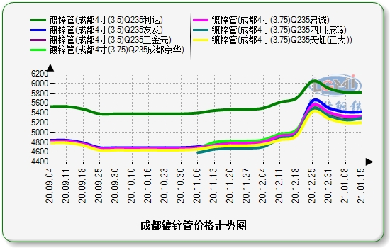 本周(1.11 -1.15)成都镀锌管市场价格持稳,截至发稿,现友发新国标产4寸(3.5mm)价格5420元,正金元产4寸(3.5mm)价格5300元,君诚产4寸(3.75mm)价格5330元,天虹(正大)产4寸(3.75mm)价格5200元,成都京华产4寸(3.75mm)价格5320元,四川振鸿产4寸(3.75mm)价格5300元,以上价格较于上周持稳。