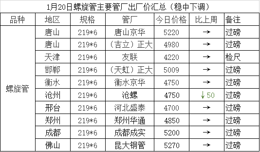 1月20日螺旋管主要管厂出厂价汇总(稳中下调)
