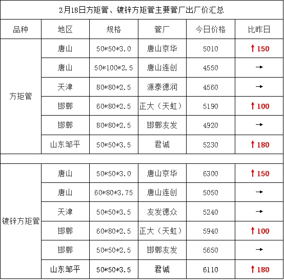2月18日方矩管、镀锌方矩管主要管厂出厂价汇总