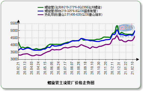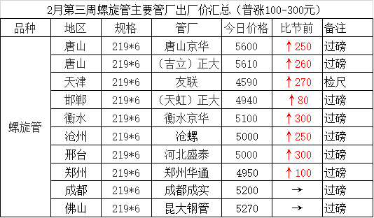 2月第三周螺旋管主要管厂出厂价汇总(普涨100-300元)