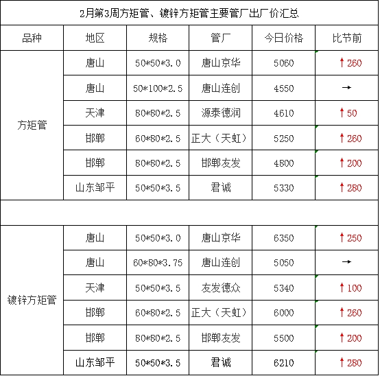 • 2月第3周方矩管、镀锌方矩管主要管厂出厂价汇总
