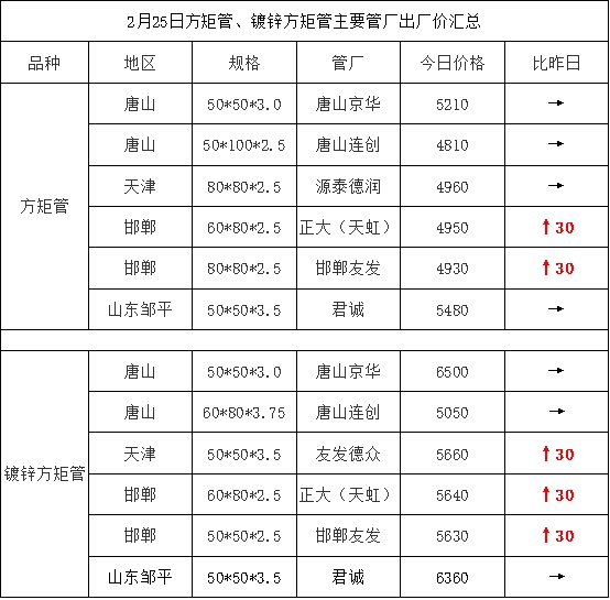 2月25日方矩管、镀锌方矩管主要管厂出厂价汇总