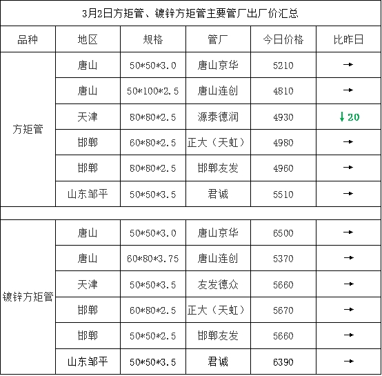 • 3月2日方矩管、镀锌方矩管主要管厂出厂价汇总