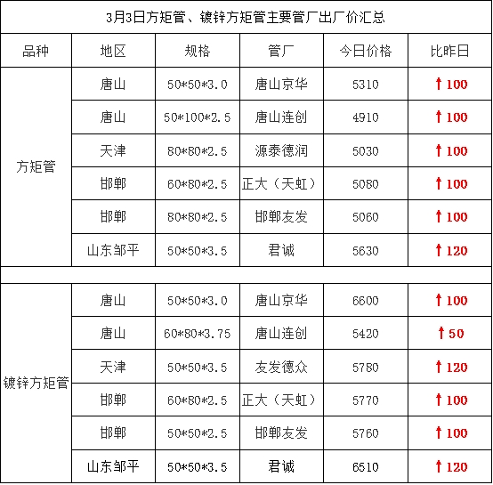 3月3日方矩管、镀锌方矩管主要管厂出厂价汇总(上调50-120)