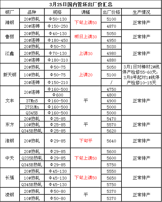 3月23日国内管坯出厂价汇总(部分上调30-50)