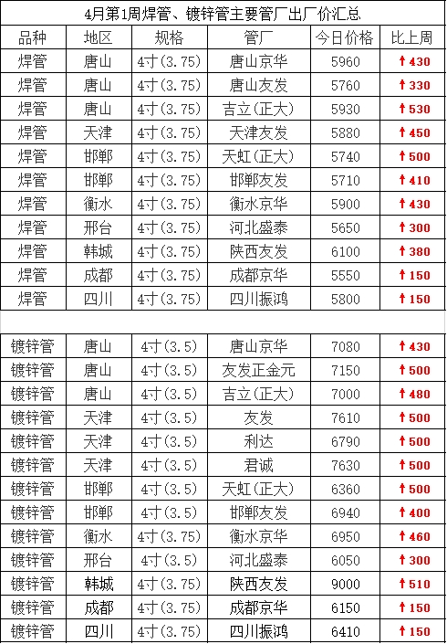• 4月第1周焊管、镀锌管主要管厂出厂价汇总
