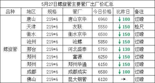 5月27日螺旋管主要管厂出厂价汇总