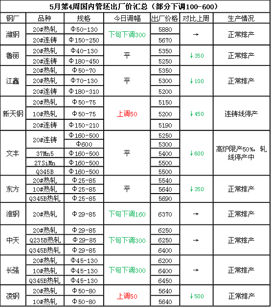 5月第4周国内管坯出厂价汇总(部分下调100-600)