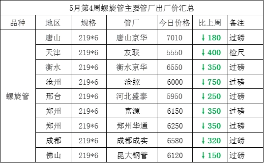 • 5月第4周螺旋管主要管厂出厂价汇总