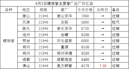 • 6月第一周螺旋管主要管厂出厂价汇总