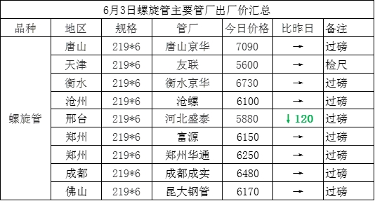 • 6月第一周螺旋管主要管厂出厂价汇总