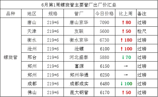 • 6月1日螺旋管主要管厂出厂价汇总