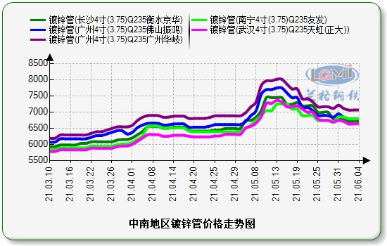 本周中南地区镀锌管市场呈窄幅震荡趋势,市场商户本周整体出货一般,现由于高价位震荡运行,下游客户开工较少,按需采购,部分采购商仍处于观望状态。市场情况来看:本周焊接钢管价格周一涨幅较大,后面几日偏稳运行,中南各地区钢材市场继续持稳观望,成交情况并无太大好转。据了解,目前终端方面恐高情绪依然较厚,基本按需采购,下游买涨不买跌,临近半年尾声,前些月由于高价支出,资金压力受到巨大影响。截止6月4日,据兰格云商监测显示:4寸3.75mm镀锌管广州地区报价:6600-6950元;武汉地区报价:6550-6650元;长沙地区报价:6600-6700元;南宁地区报价:6600-6750元;以上地区均较上周上涨30-50元。
