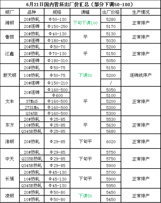 6月21日国内管坯出厂价汇总(部分下调50-100)