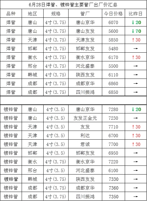 • 6月28日焊管、镀锌管主要管厂出厂挂牌价汇总