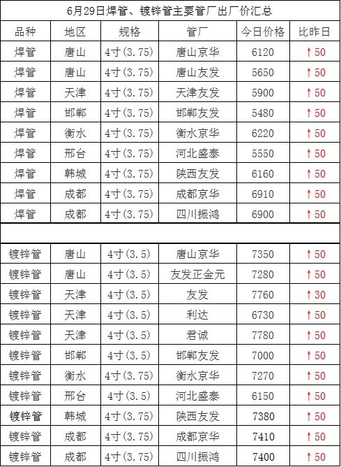 6月29日焊管、镀锌管主要管厂出厂挂牌价汇总