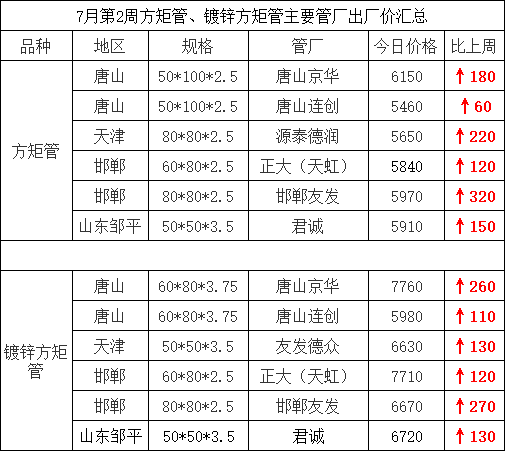 • 7月第1周方矩管主要管厂出厂挂牌价汇总