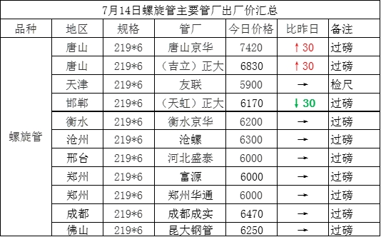 7月14日螺旋管主要管厂出厂价汇总