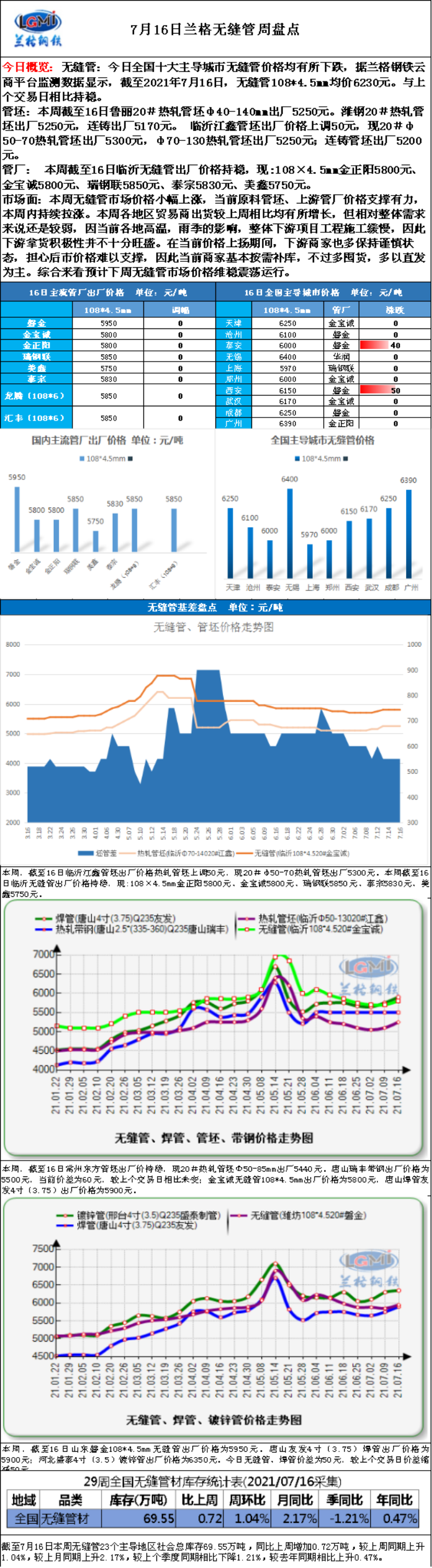 - 兰格无缝钢管周盘点(7.16):无缝管市场价格上扬 上游厂家价格支撑有力2021/7/16