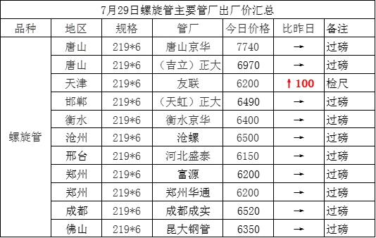 7月29日螺旋管主要管厂出厂价汇总