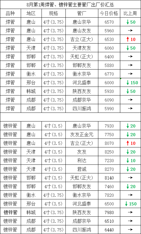 8月第1周焊管、镀锌管主要管厂出厂价汇总
