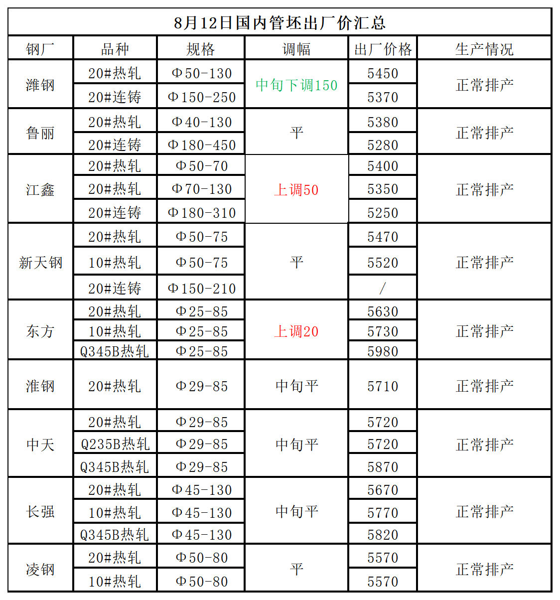 8月12日国内管坯出厂价格汇总