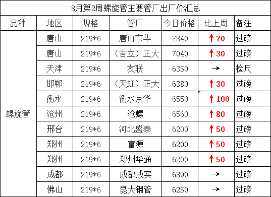 • 8月第2周螺旋管主要管厂出厂价汇总