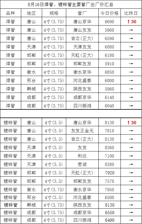 • 8月16日焊管、镀锌管主要管厂出厂挂牌价汇总