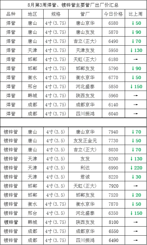 • 8月第2周焊管、镀锌管主要管厂出厂价汇总