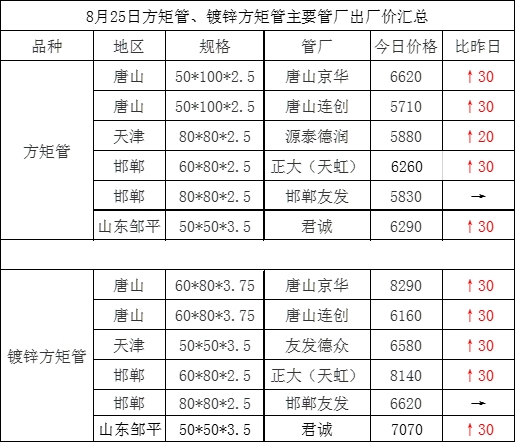 • 8月25日方矩管主要管厂出厂挂牌价汇总