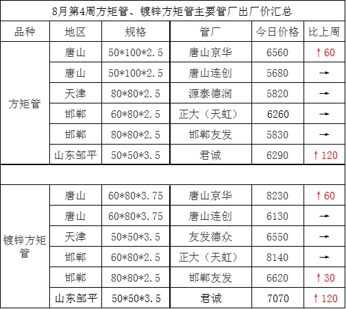 8月第4周方矩管主要管厂出厂挂牌价汇总