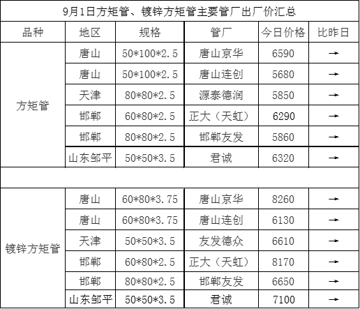9月1日方矩管主要管厂出厂挂牌价汇总