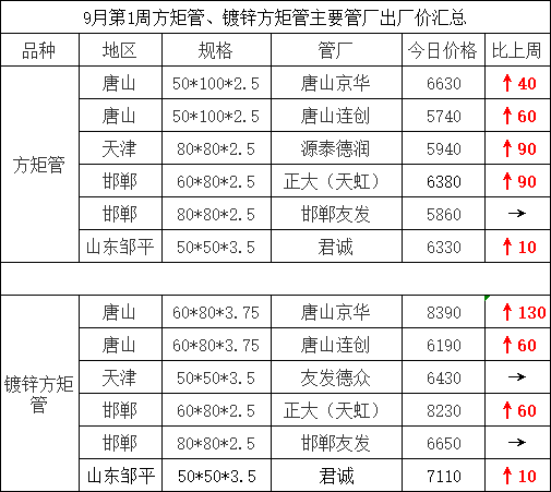 9月第1周方矩管、镀锌方矩管主要管厂出厂价汇总