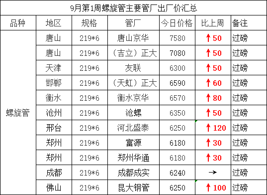 • 9月第1周螺旋管主要管厂出厂价汇总