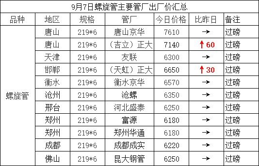 • 9月第1周螺旋管主要管厂出厂价汇总