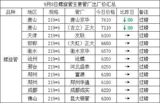 • 9月第1周螺旋管主要管厂出厂价汇总