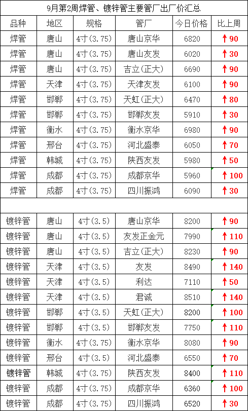 • 9月第2周焊管、镀锌管主要管厂出厂价汇总