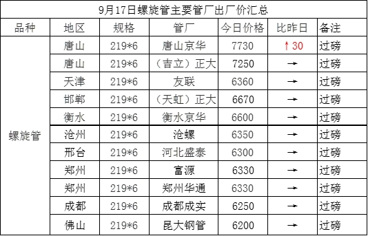 9月17日螺旋管主要管厂出厂价汇总
