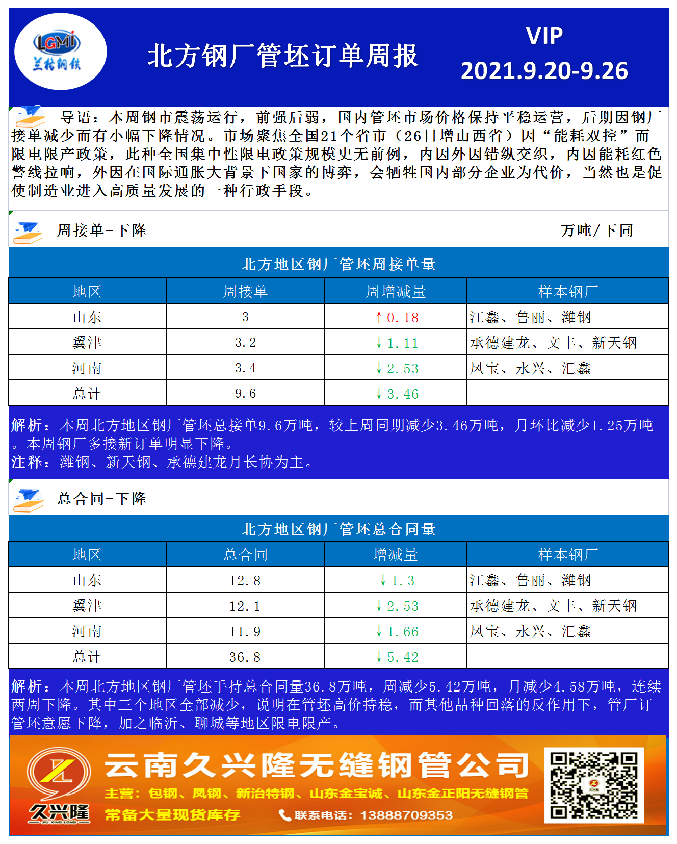 兰格调研:北方钢厂管坯订单周报(9.22-9.26)